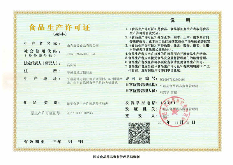 輝煌介紹,          山東輝煌食品有限公司始創(chuàng)于1998年,是一家集研發(fā)、生產(chǎn)、銷售、出口貿(mào)易為一體的現(xiàn)代化重點龍頭企業(yè)。公司以“互利共贏,基業(yè)長青”的經(jīng)營理念為指引,在不斷鞏固和發(fā)展罐頭產(chǎn)業(yè)的基礎(chǔ)上,已逐步成長為涉及金融、電商、酒店等產(chǎn)業(yè)的綜合性公司。 公司技術(shù)先進,裝備優(yōu)良,建有市級企業(yè)技術(shù)中心及臨沂市“果醬及水果罐頭加工工程實驗室“,2021年被認定為”山東省‘專精特新’中小企業(yè)“。產(chǎn)品在占領(lǐng)國內(nèi)市場的同時,遠銷歐、美、日、俄、蒙古等國家和地區(qū)。 公司始終堅持以市場為導(dǎo)向,以質(zhì)量求生存。先后通過了ISO、BRC、IFS等國際認證,被評為“消費者滿意單位”、 “最具競爭力中小企業(yè)·百強企業(yè)”,2014年被央視商城評為“中國好物種”,2018年山東省食安辦授予“食安山東·生產(chǎn)加工示范企業(yè)”,并先后獲得“省級守合同重信用企業(yè)”、“山東省著名商標(biāo)”、“中國罐藏食品領(lǐng)先品牌”等榮譽稱號。 潮平兩岸闊,風(fēng)正一帆懸。輝煌人正以堅定的信念、昂揚的斗志,秉承“創(chuàng)百年大品牌,造中國好罐頭”的宗旨,堅持“專注穩(wěn)健,務(wù)實高效”的企業(yè)作風(fēng),致力于“做中國罐頭行業(yè)持續(xù)領(lǐng)先企業(yè)”的輝煌愿景!
